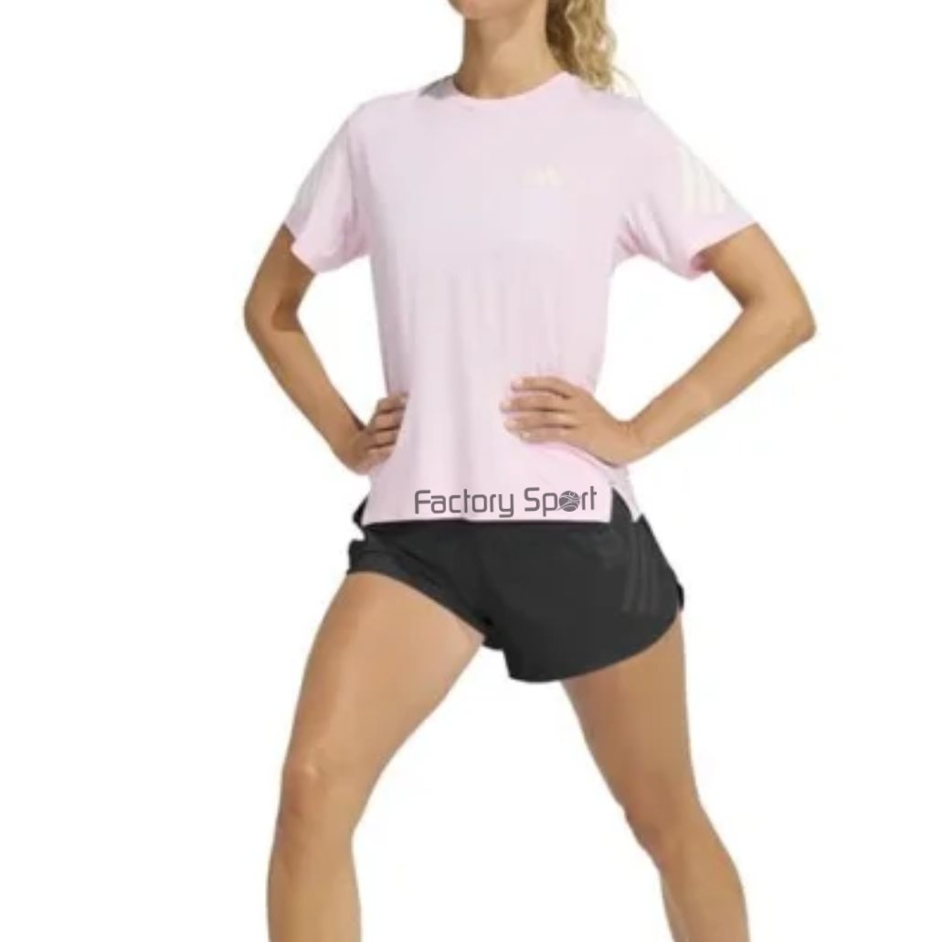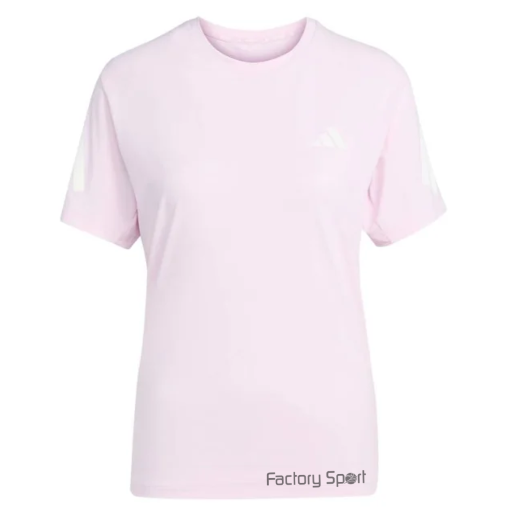 Camiseta de mujer de poliester en color rosa. Cuenta con el logo y las rayas de los brazos en blanco reflectante. Tejido fresco y de secado rápido.