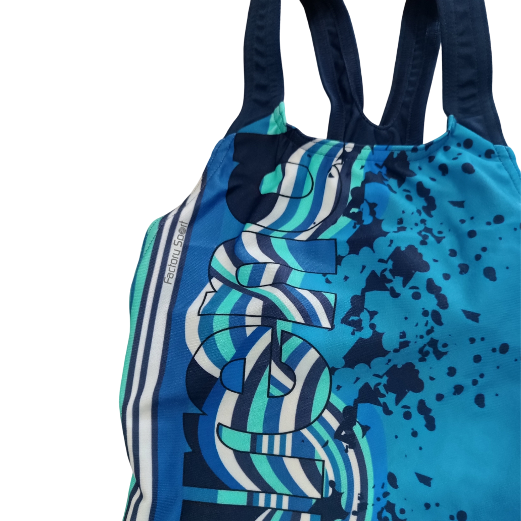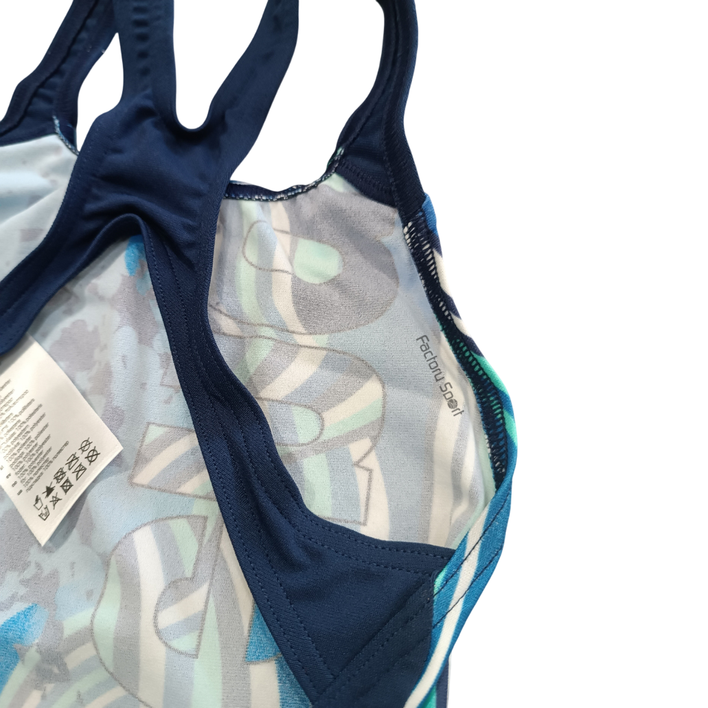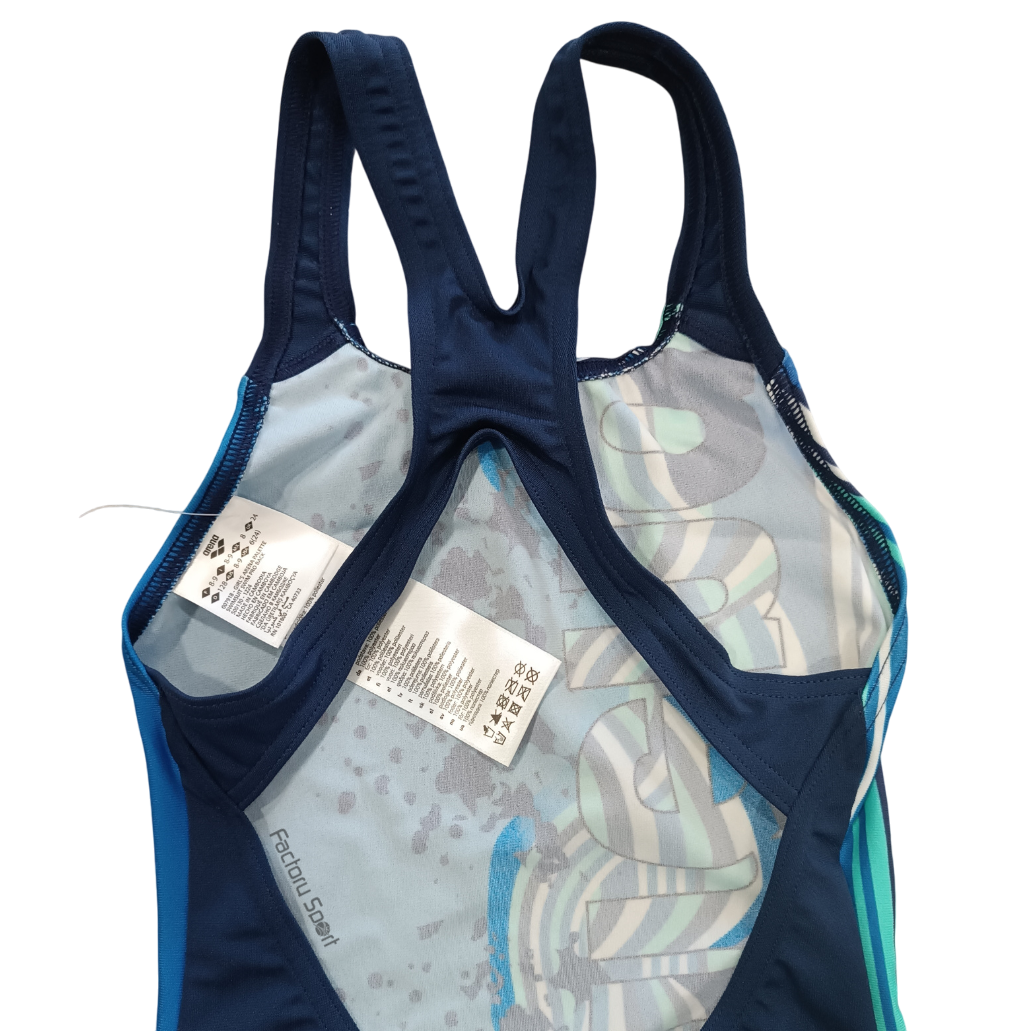 Bañador de Arena para niña en color azul y marino, con espalda con aperturas, tejido bien sujeto.