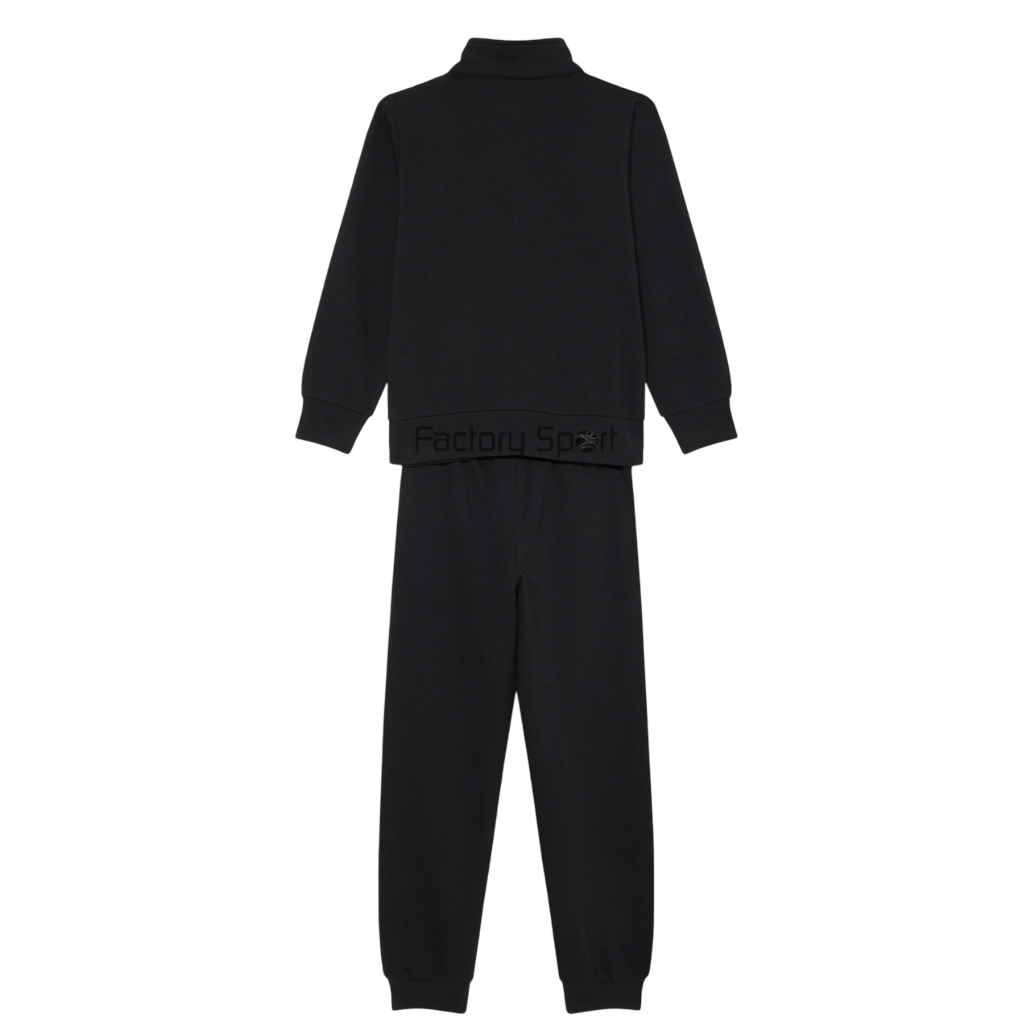 Chandal de niño en color negro, chaqueta con cremallera hasta abajo y pequeño logo en color blanco, pantalon ajustable en la cintura con puños y con pelito por dentro