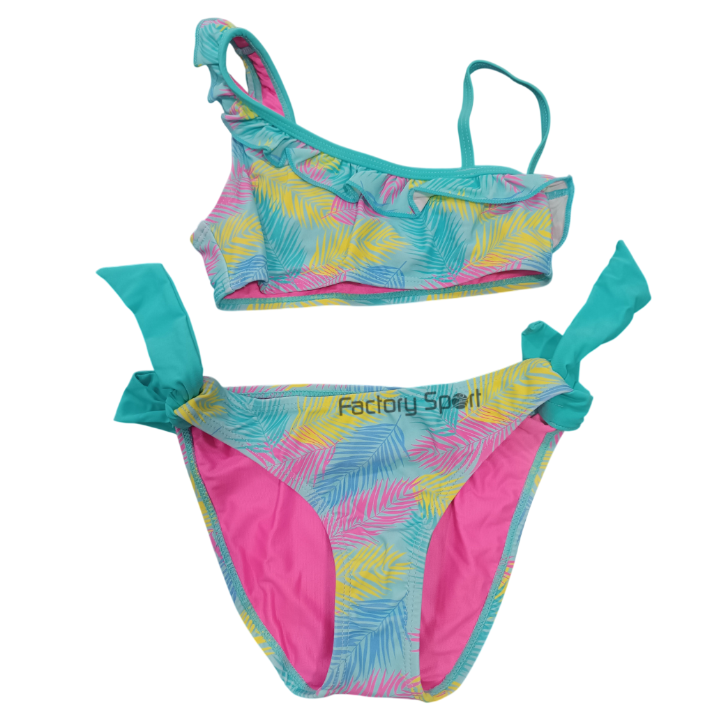 Bikini de niña en color celeste con rosa con amarillo, parte de abajo con una lazada y para superior con un tirante regulable
