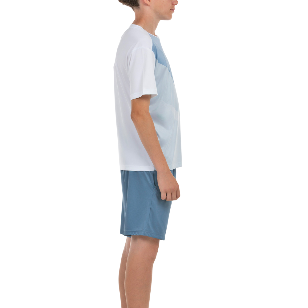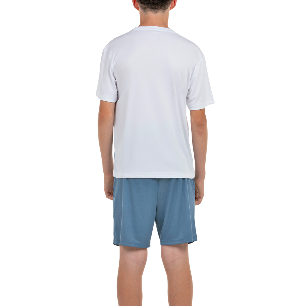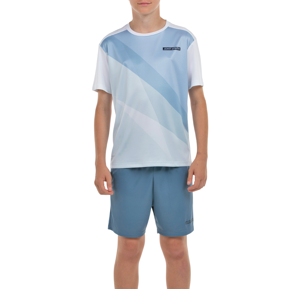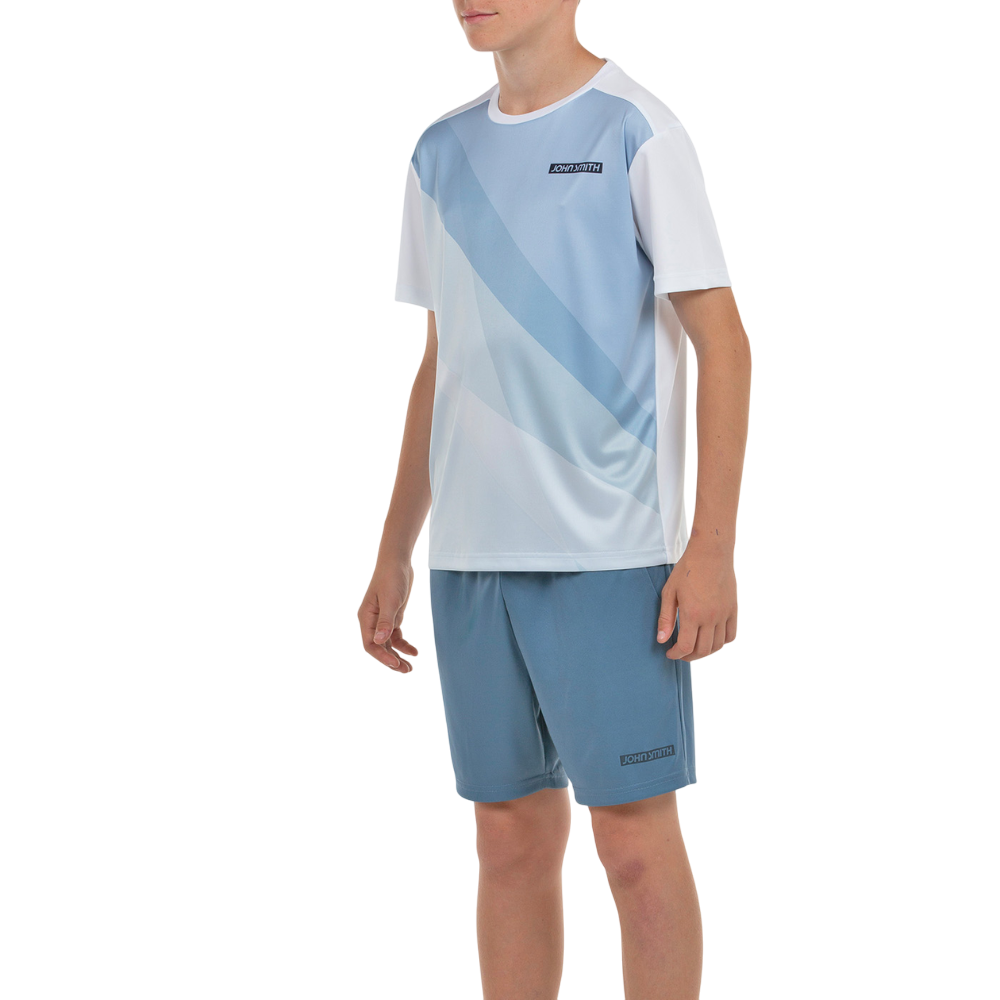 Conjunto poliéster Jhon Smith BERME para niño compuesto por una camiseta de manga corta y un pantalón corto. Color blanco/azul acero.