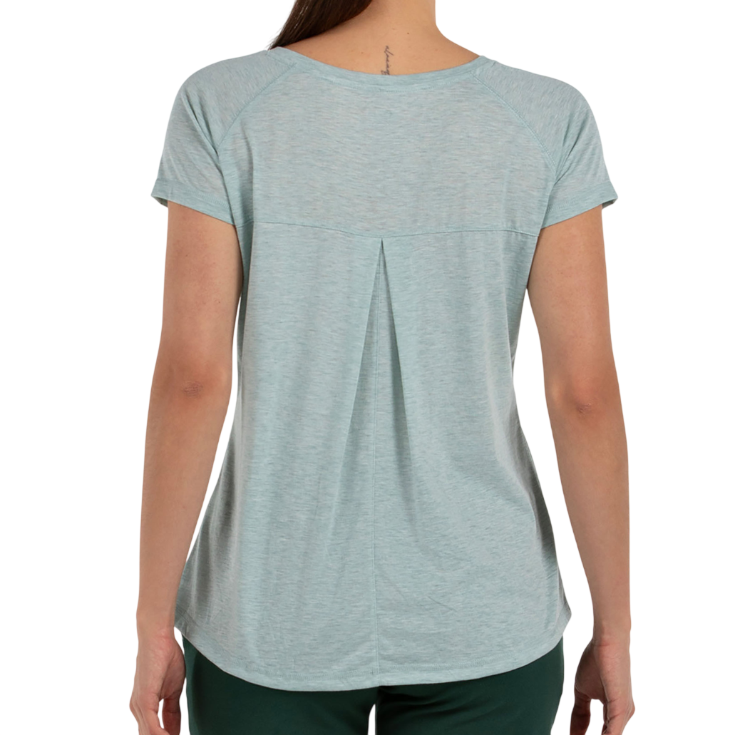 Camiseta de manga corta de mujer en color eucalipto, cuenta con un pliegue en la espalda, lo que le da más movimiento a la camiseta