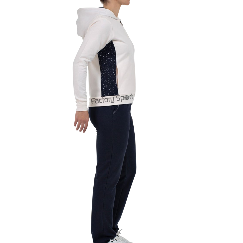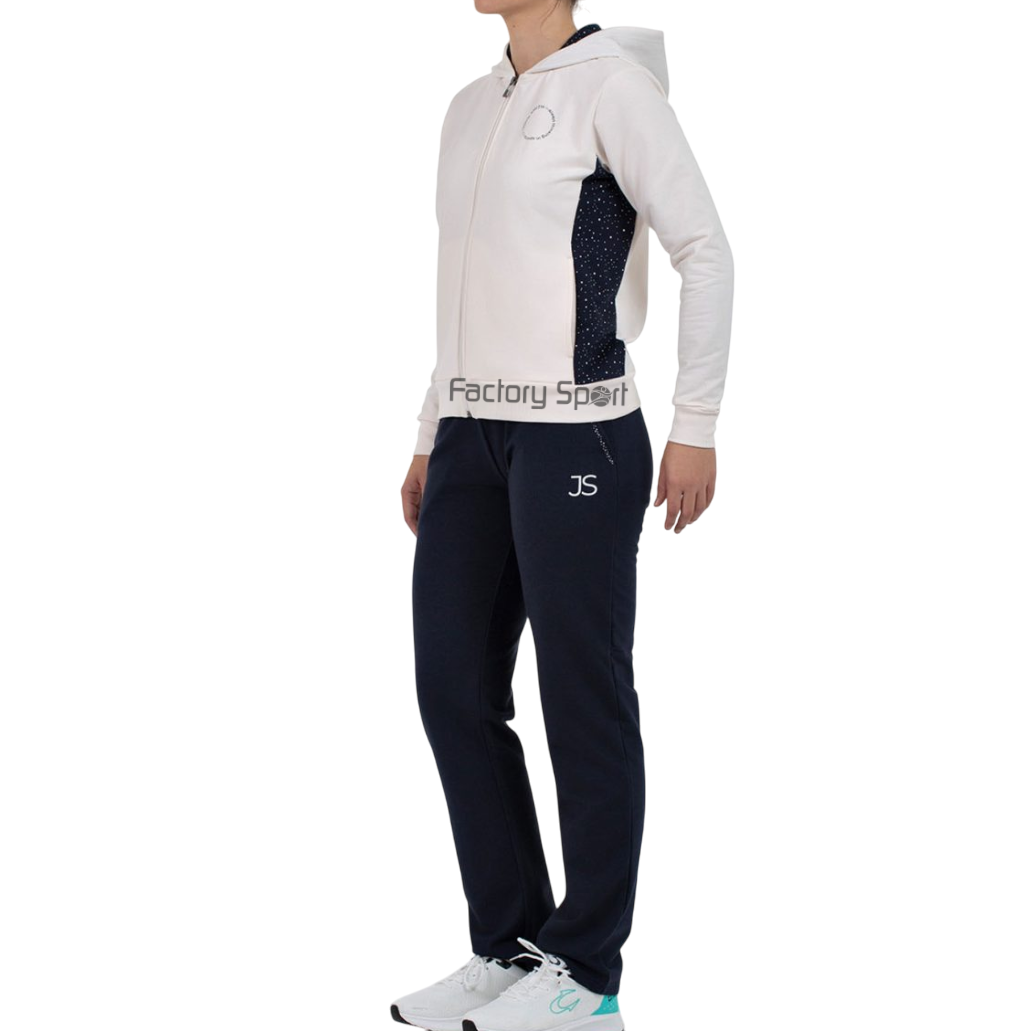 Este chándal combina la comodidad de la felpa elástica con un diseño moderno y funcional. La sudadera es abierta, con laterales a contraste que aportan dinamismo, capucha con forro estampado y gráfico decorativo en el delantero. Rib en puños y bajo para un ajuste perfecto. El pantalón cuenta con cinturilla elástica, bolsillos laterales y un gráfico decorativo que completa el look con personalidad.