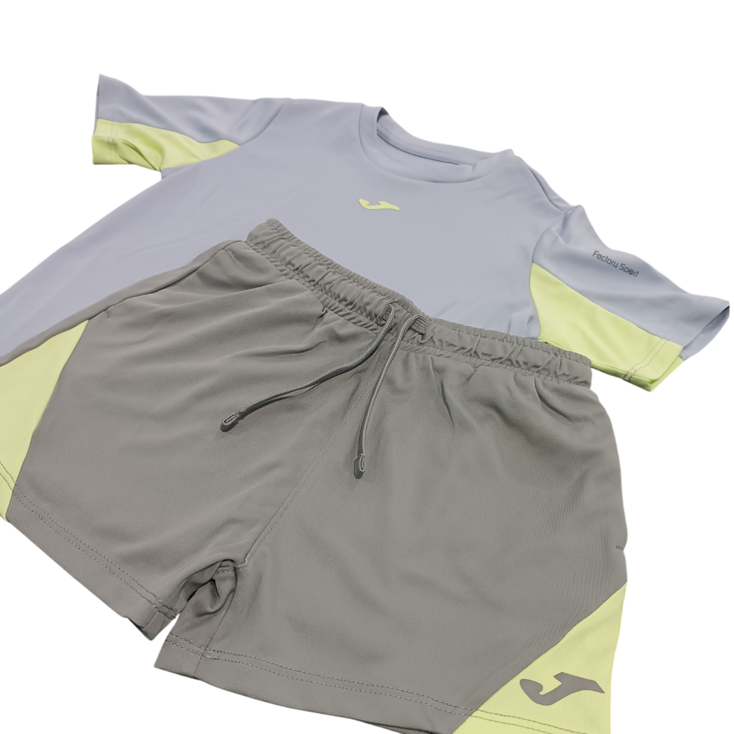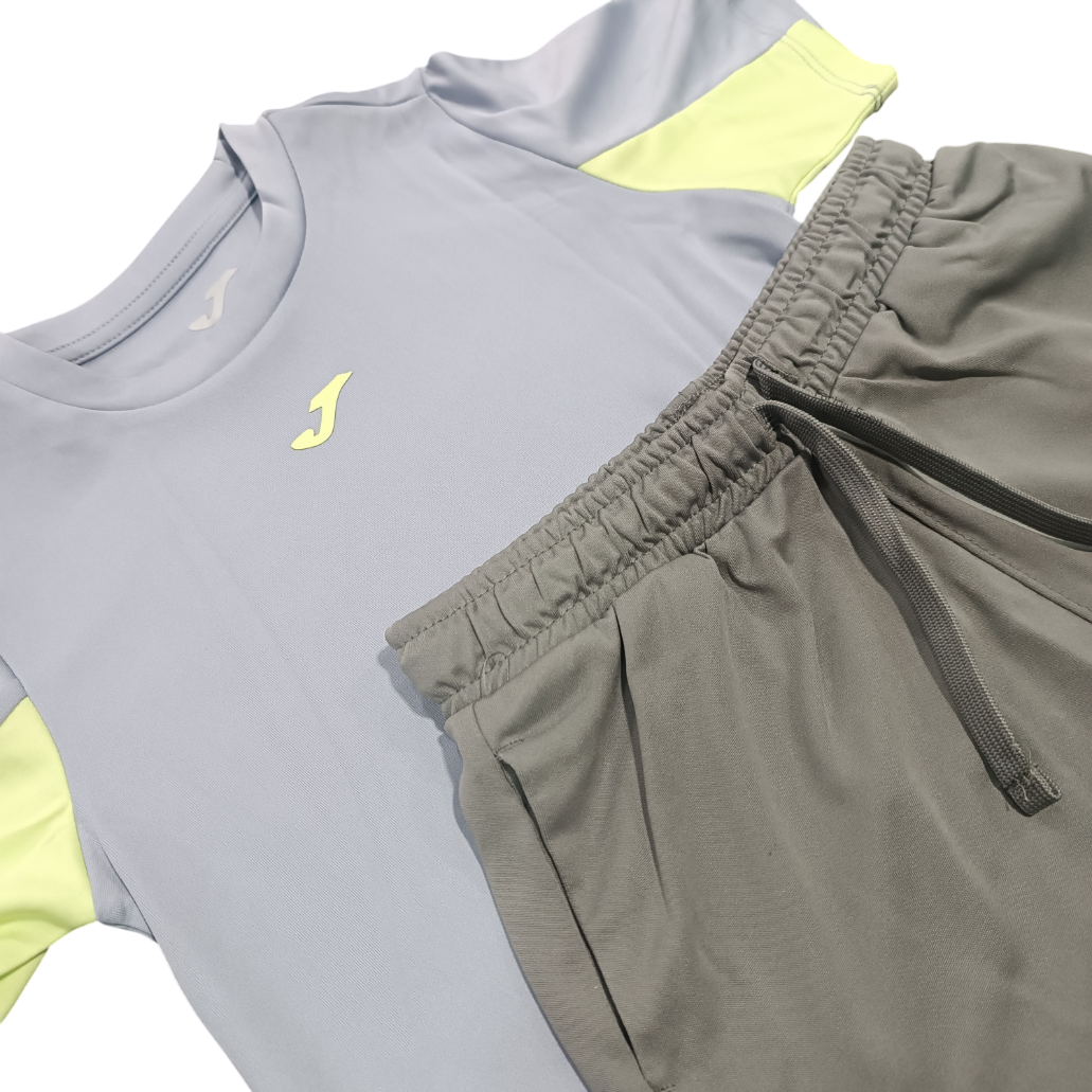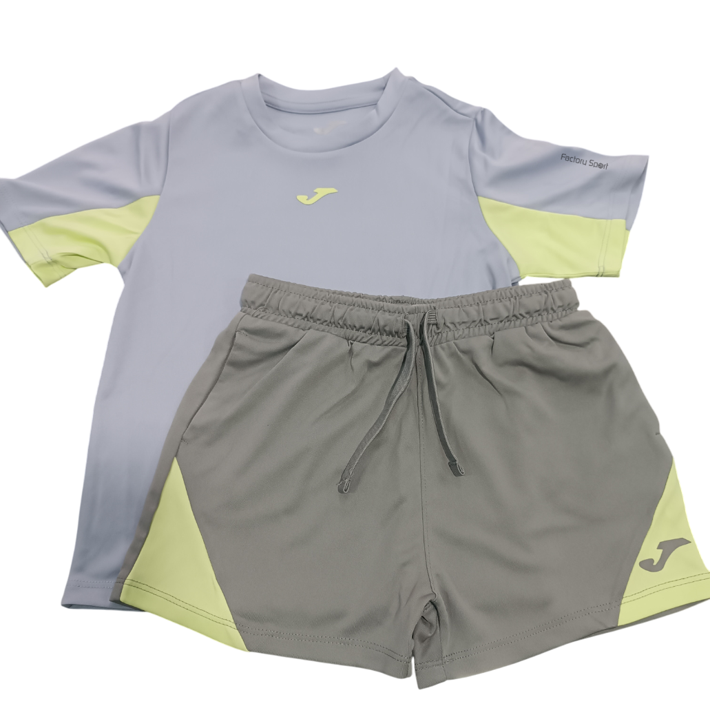 Conjunto de niño de Joma, con camiseta en color azul acero con detalles en lima y pantalón gris, con cintura ajustable.