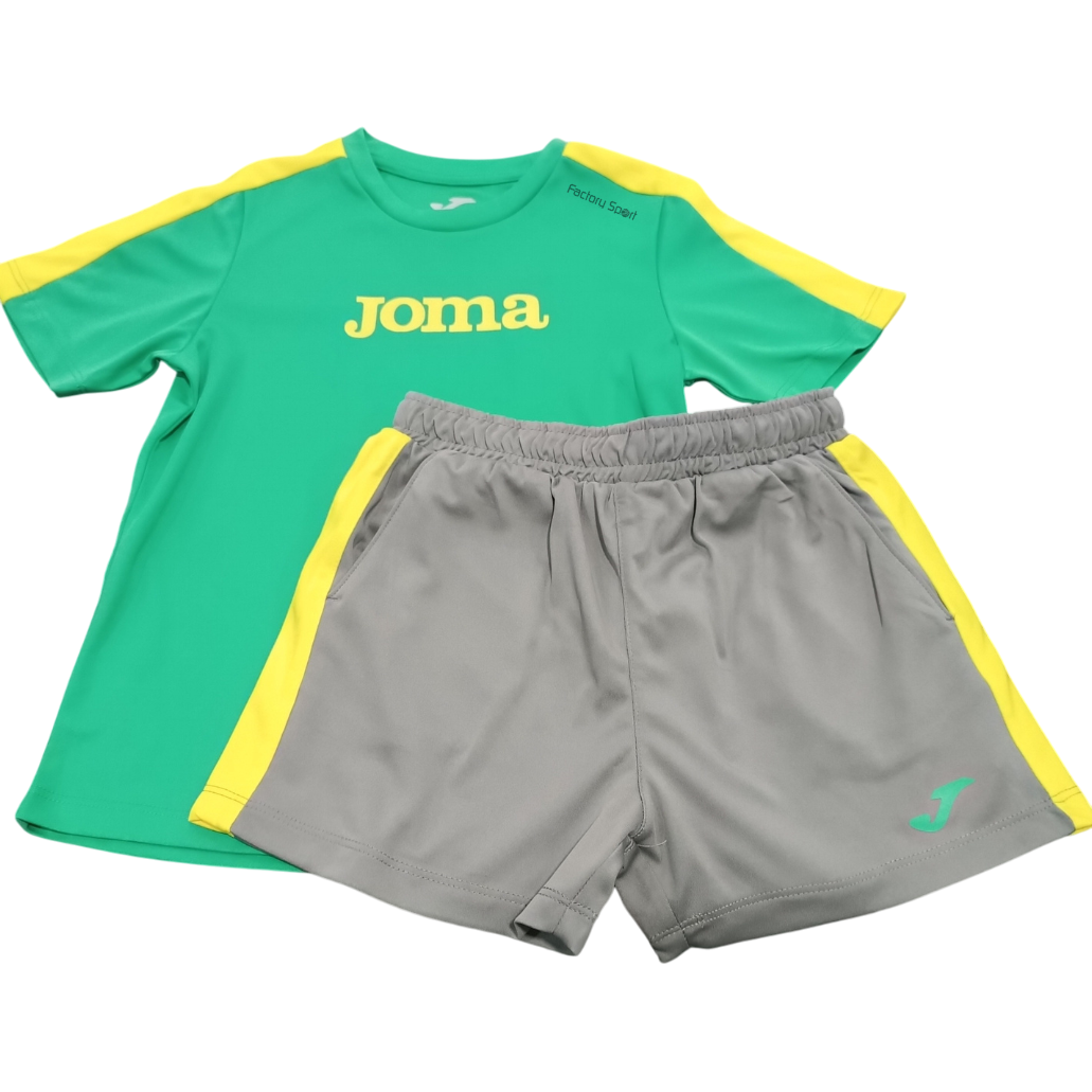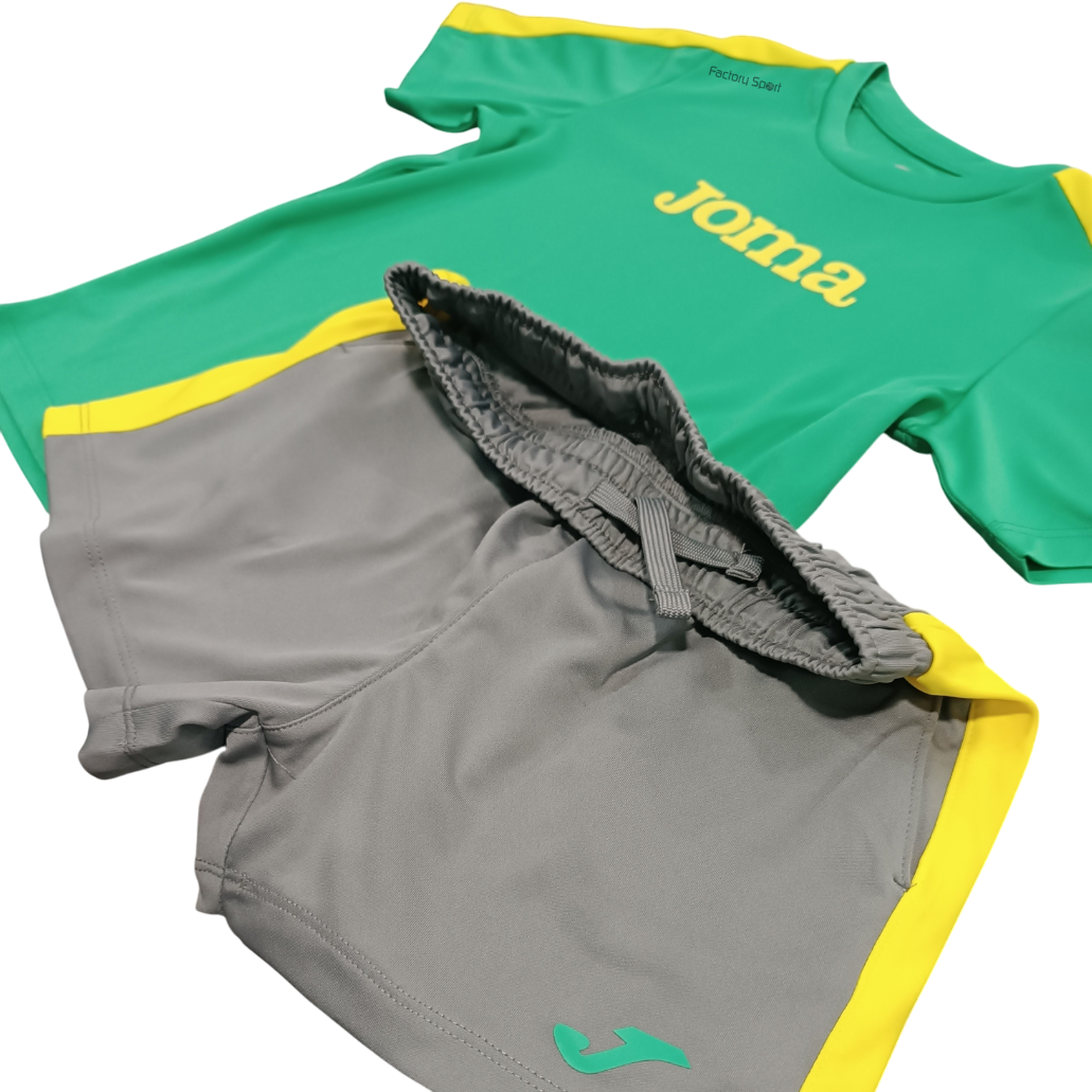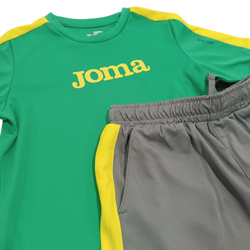 Conjunto de Joma para niño con camiseta de color verde con detalles en amarillo y letras en igual color, con pantalones en gris con ajustable en la cintura