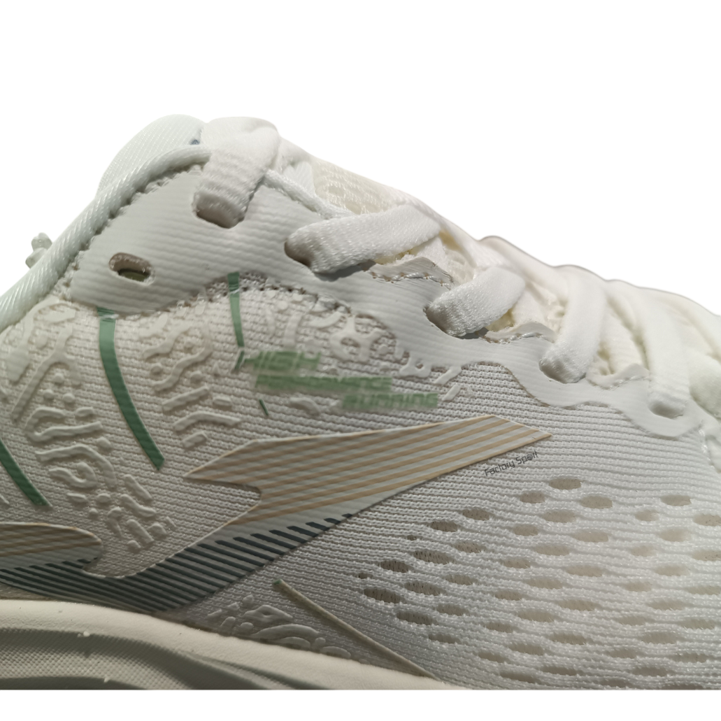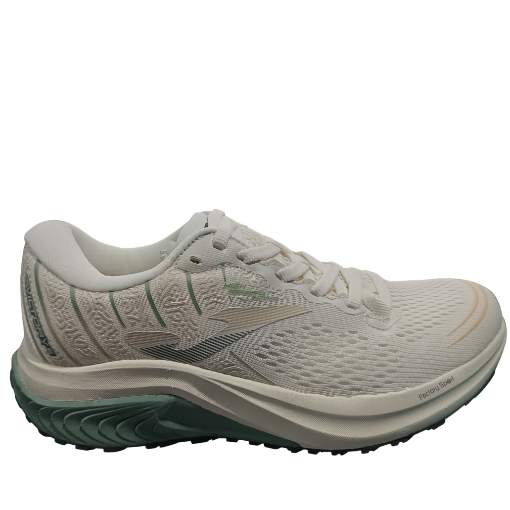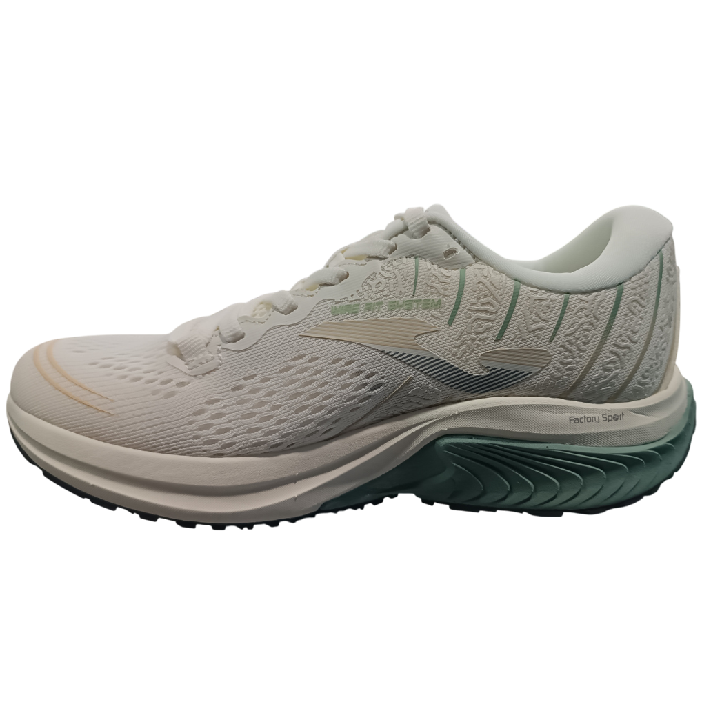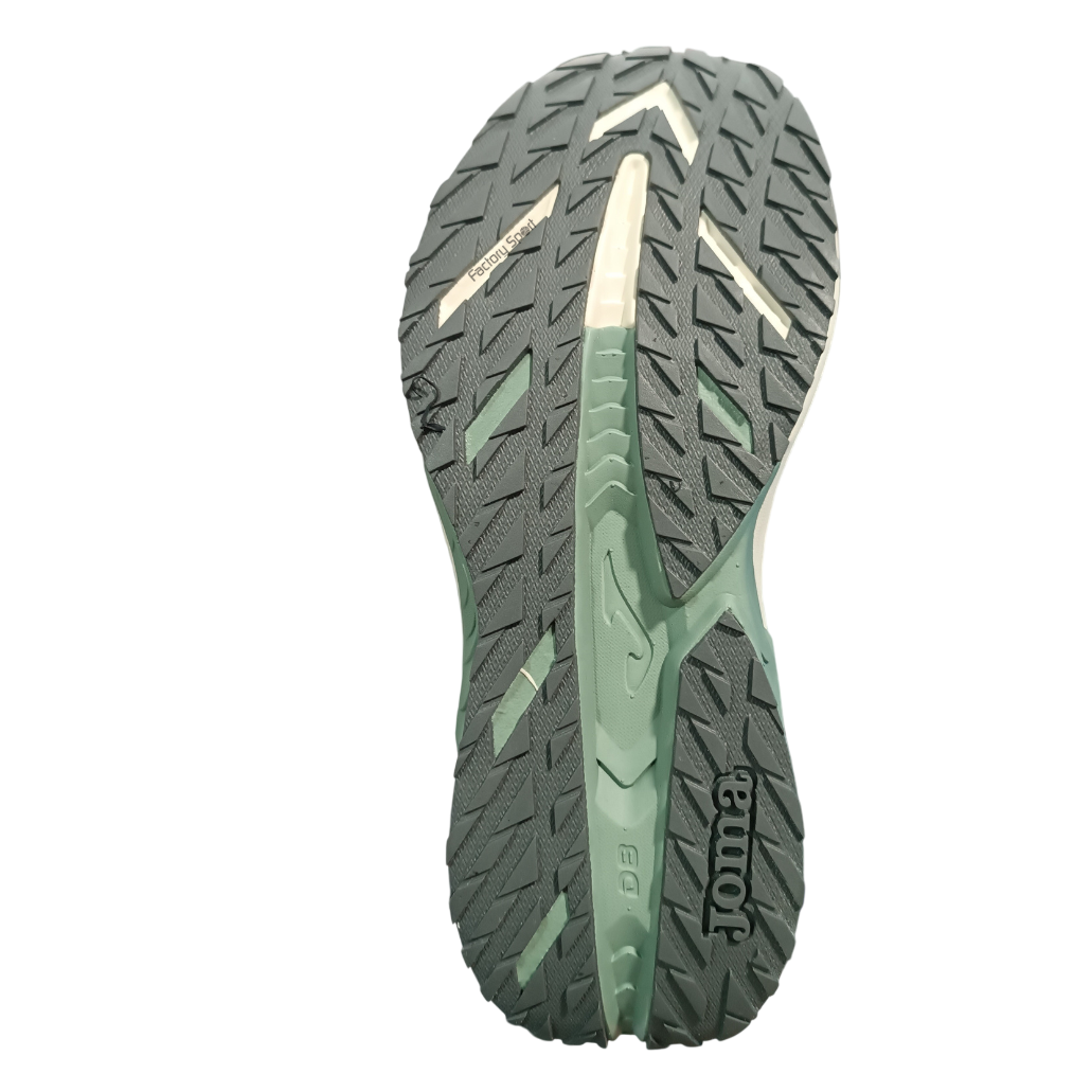 Zapatillas de running de mujer de la marca Joma en color beige con detales y suela en color verde.