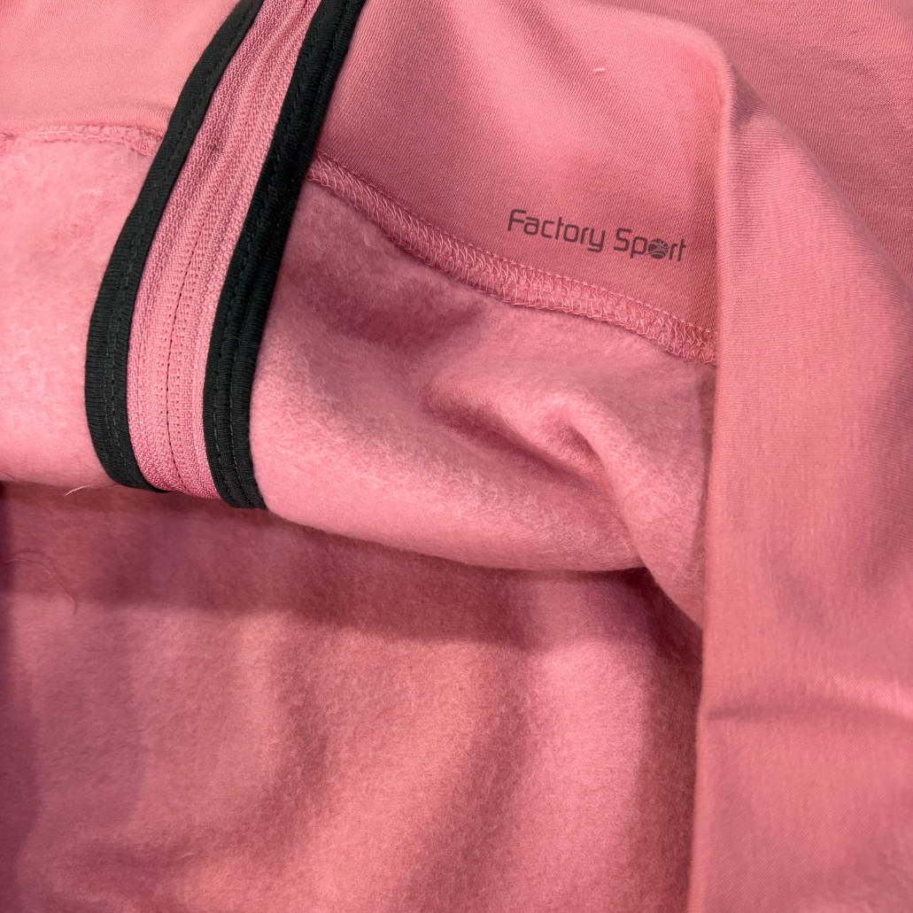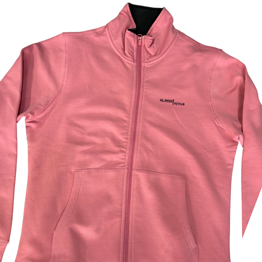 Chandal de mujer con chaqueta en rosa con cremallera hasta abajo, bosillos, y pantalón en negro con cintura ajustable y pelito