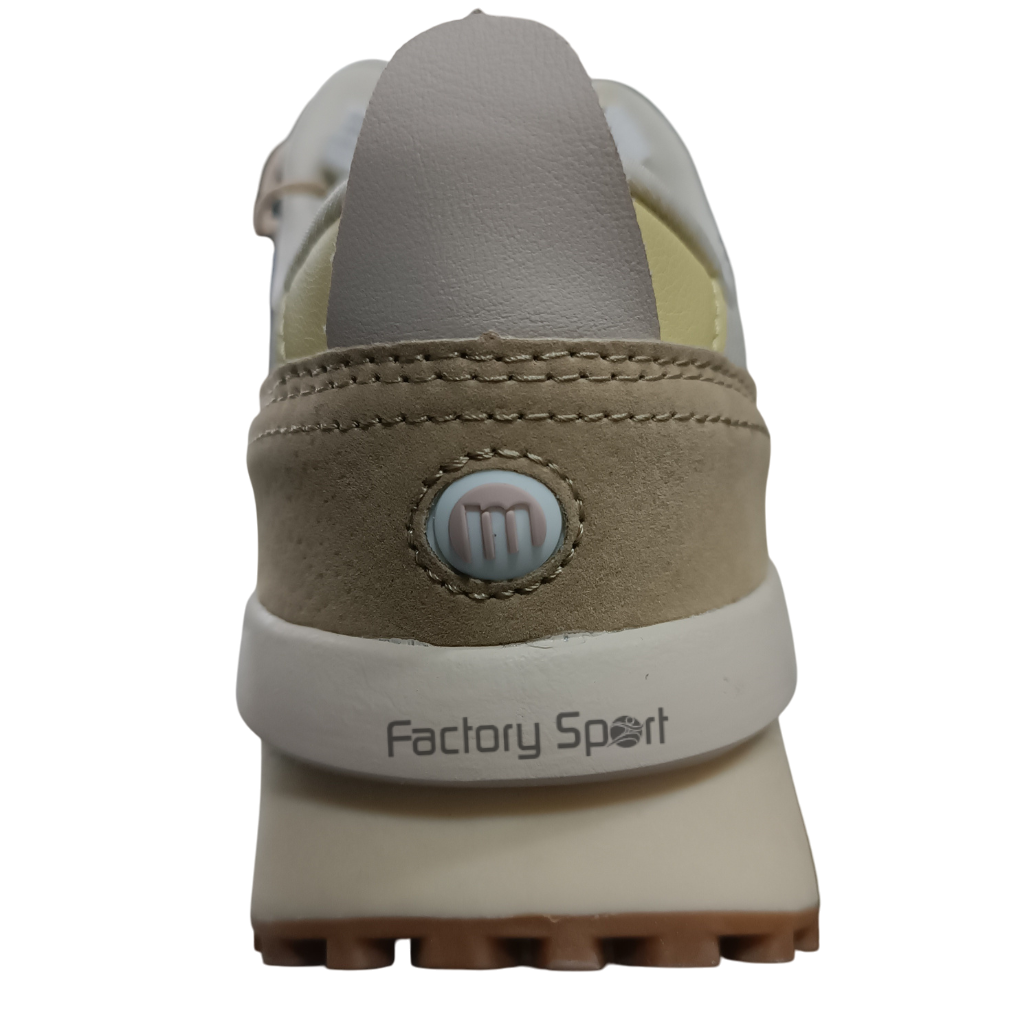 Zapatillas de mujer en colores claritos, con tela y piel, la M en color rosa con detalles amarillos. Suela con agarre y plantilla Comfort foam.