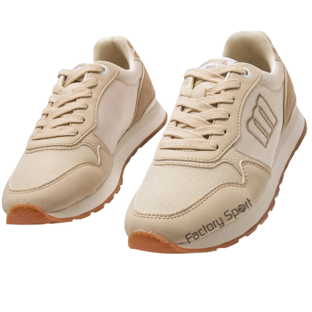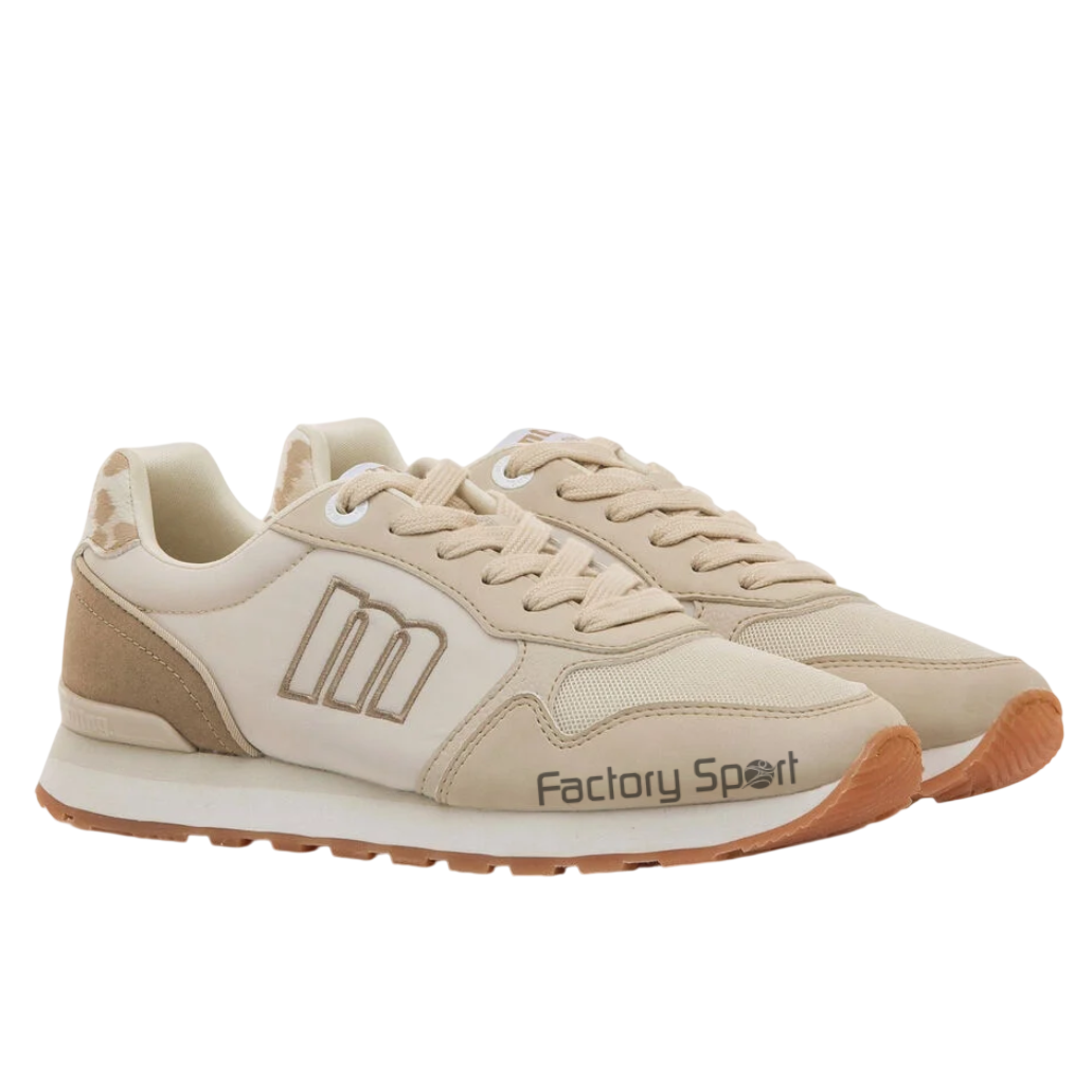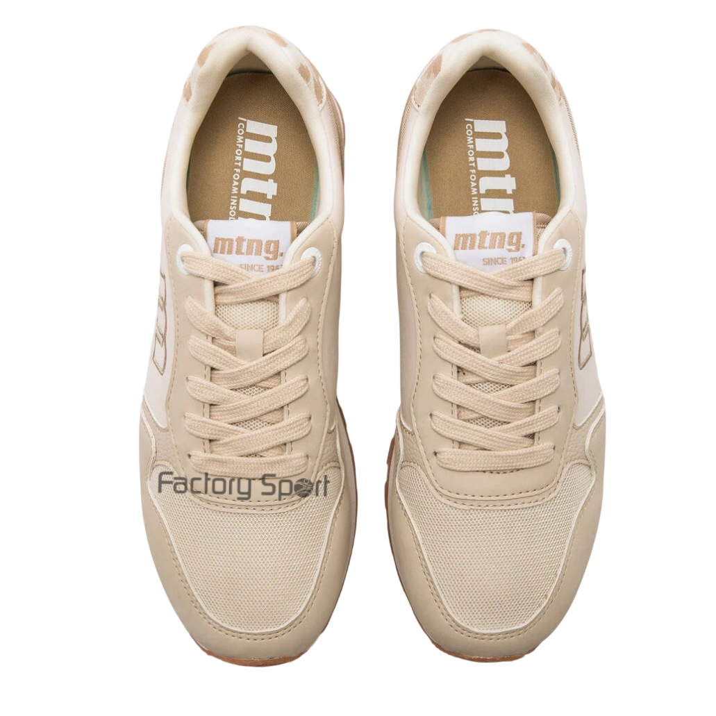 Zapatillas de color beige para mujer de la marca Mustang, modelo Joggo Classic, de estilo deportivo urbano. Este diseño combina paneles en tonos claros con detalles texturizados y malla en la parte delantera para favorecer la ventilación. El refuerzo trasero incorpora un estampado animal print sutil, que añade un toque distintivo al conjunto. La suela dentada color caramelo y las plantillas con tecnología Starfit, mejoran la comodidad en cada paso. Con cierre de cordones y logo lateral bordado, es una opción cómoda y versáti