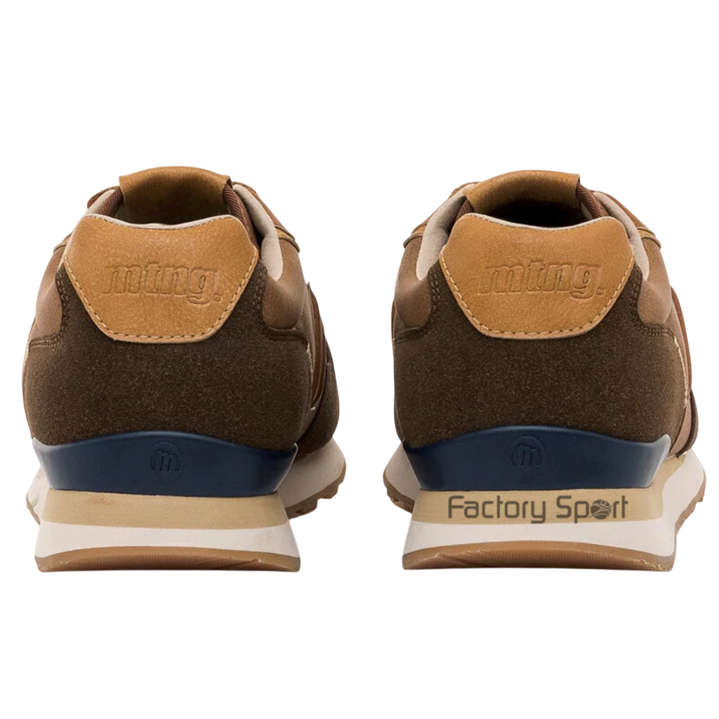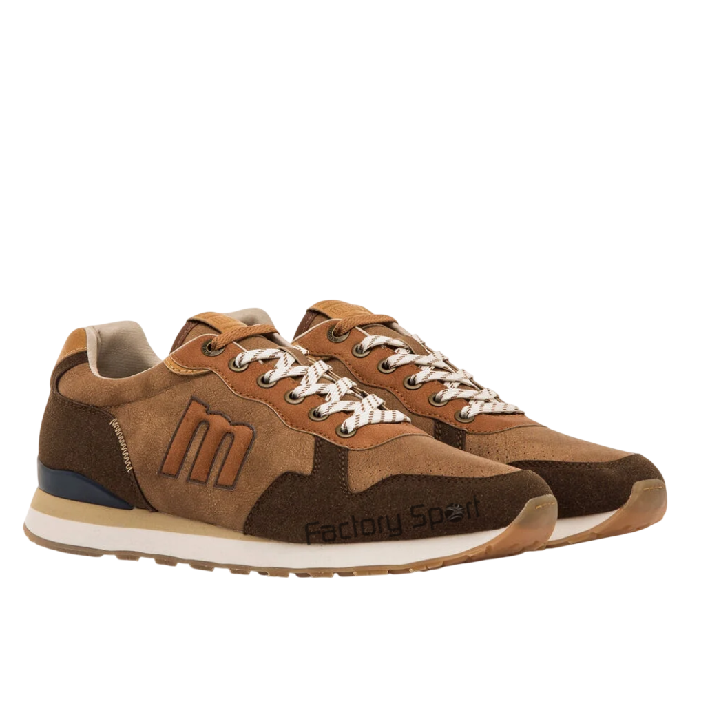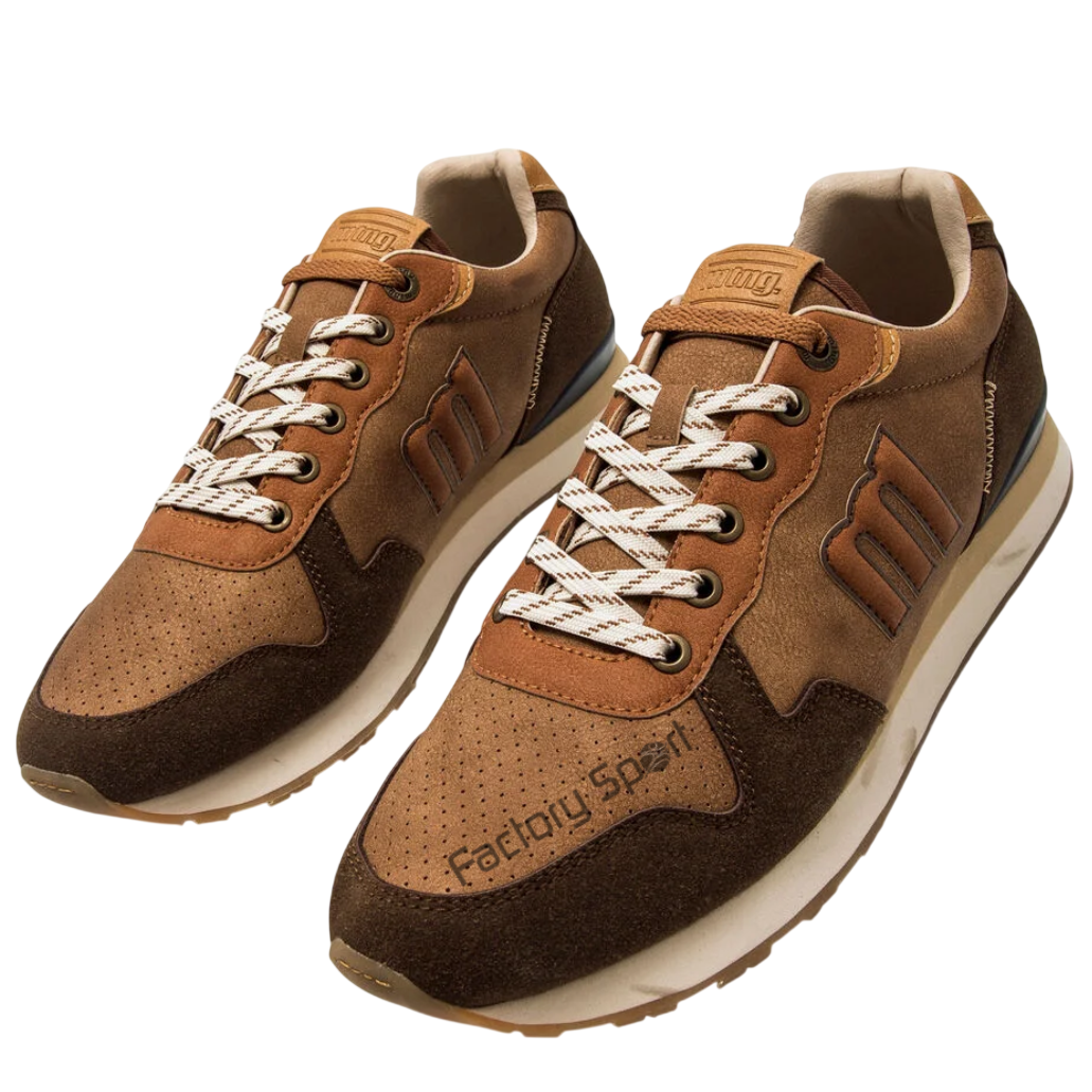 Zapatillas marrones para hombre, modelo Porland de la marca Mustang, con estilo urbano y toque retro. Diseñadas con mezcla de paneles en distintos tonos tierra, estas zapatillas ofrecen un look versátil para combinar con outfits casuales. El logotipo lateral, los cordones bicolor y la suela dentada de goma refuerzan su diseño dinámico. La estructura ligera y sus plantillas con tecnología Starfit, mejoran la comodidad en cada paso, manteniendo un equilibrio entre funcionalidad y estética deportiva.